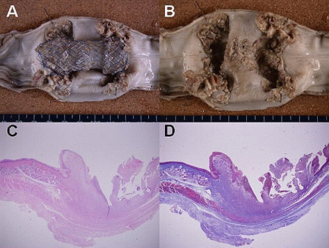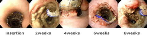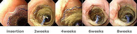 Tissue response has started to develop at the 2nd week from the insertion of a conventional stent. At the 4th week, granulation tissue was found and the stent became completely enbeded into the esophageal mucosa at the 6th week. At the 8th week, massive granulation tissue resulted in partial esophageal stricture. |