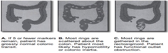 Background: A colon transit time test using radio-opaque markers (CTTRM) is considered the gold standard for evaluating colon transit function. In most instances, constipation is considered idiopathic or functional. The total and segmental colonic transit time, traced by radio-opaque markers, makes possible the identification of the colon segment that has the motility alteration that causes constipation.